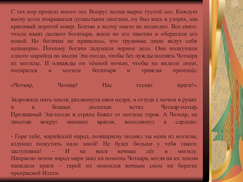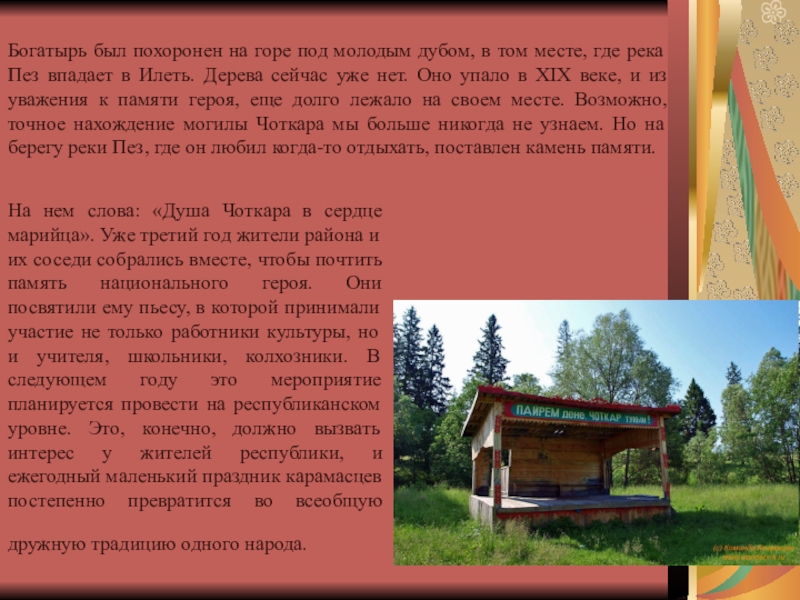 На нем слова: «Душа Чоткара в сердце марийца». Уже третий год жители района и их соседи собрались вместе, чтобы почтить память национального героя. Они посвятили ему пьесу, в которой принимали участие не только работники культуры, но и учителя, школьники, колхозники. В следующем году это мероприятие планируется провести на республиканском уровне. Это, конечно, должно вызвать интерес у жителей республики, и ежегодный маленький праздник карамасцев постепенно превратится во всеобщую дружную традицию одного народа.