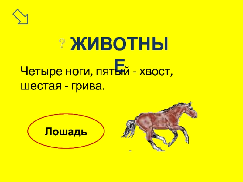 ЖИВОТНЫЕЧетыре ноги, пятый - хвост, шестая - грива.Лошадь