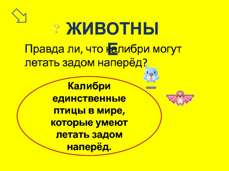 ЖИВОТНЫЕПравда ли, что калибри могут летать задом наперёд?Калибри единственные птицы в мире, которые умеют летать задом наперёд.