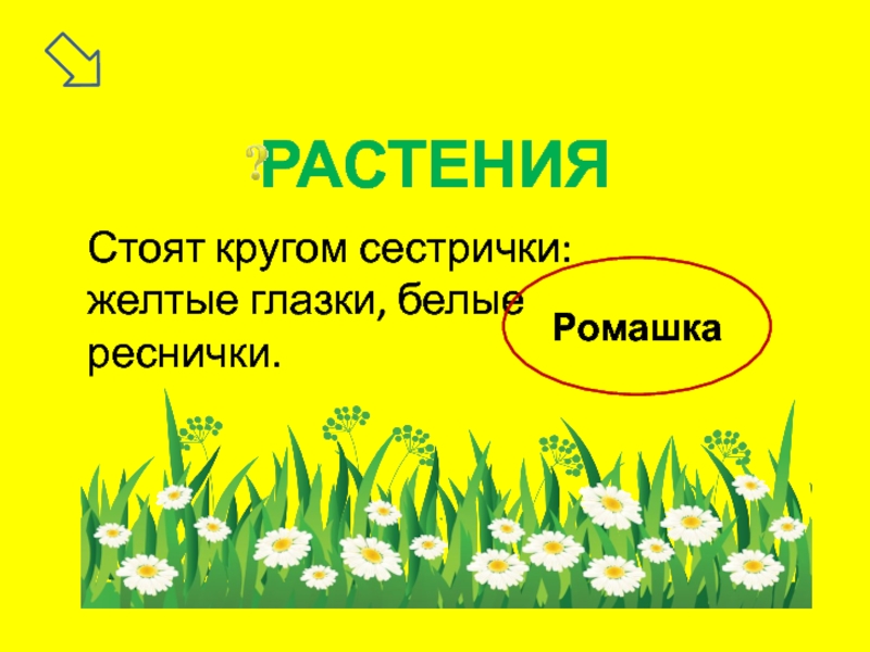 Стоят кругом сестрички: желтые глазки, белые реснички.РомашкаРАСТЕНИЯ