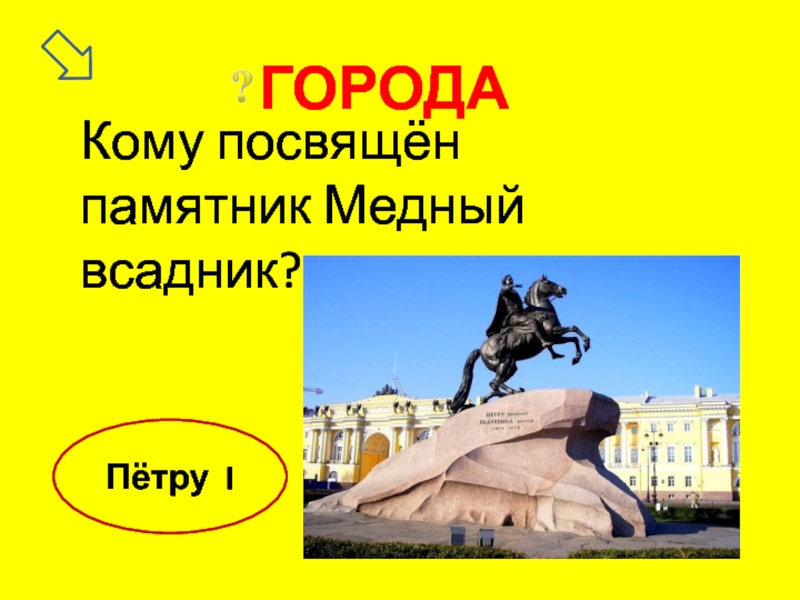 ГородаКому посвящён памятник Медный всадник?Пётру I