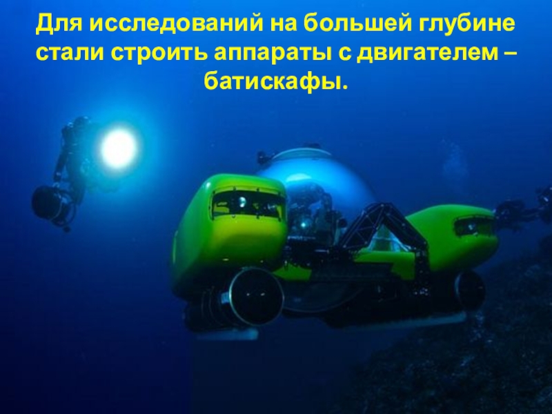 Слайд 5Для исследований на большей глубине стали строить аппараты с двигателем –