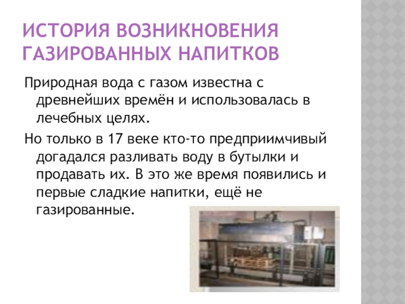 Но только в 17 веке кто-то предприимчивый догадался разливать воду в бутылки и продавать их. В это же время появились и первые сладкие напитки, ещё не газированные.