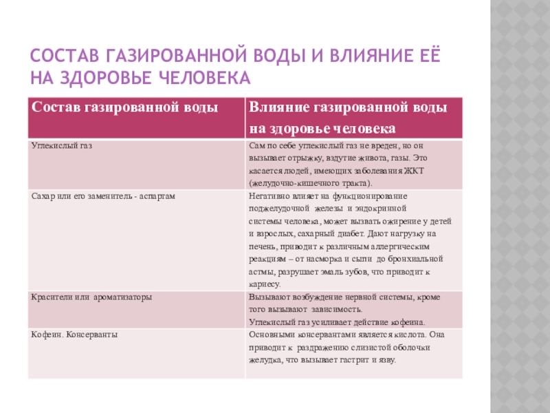 Слайд 13Состав газированной воды и влияние её на здоровье человека