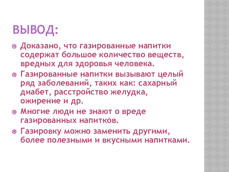 Газированные напитки вызывают целый ряд заболеваний, таких как: сахарный диабет, расстройство желудка, ожирение и др.