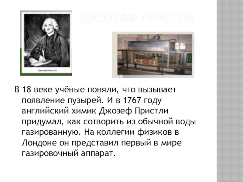 В 18 веке учёные поняли, что вызывает появление пузырей. И в 1767 году английский химик Джозеф Пристли придумал, как сотворить из обычной воды газированную. На коллегии физиков в Лондоне он представил первый в мире газировочный аппарат.