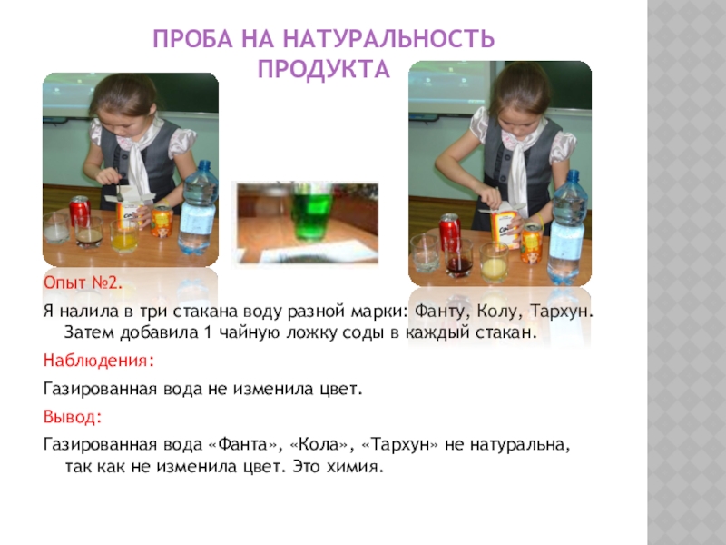 Газированная вода «Фанта», «Кола», «Тархун» не натуральна, так как не изменила цвет. Это химия.