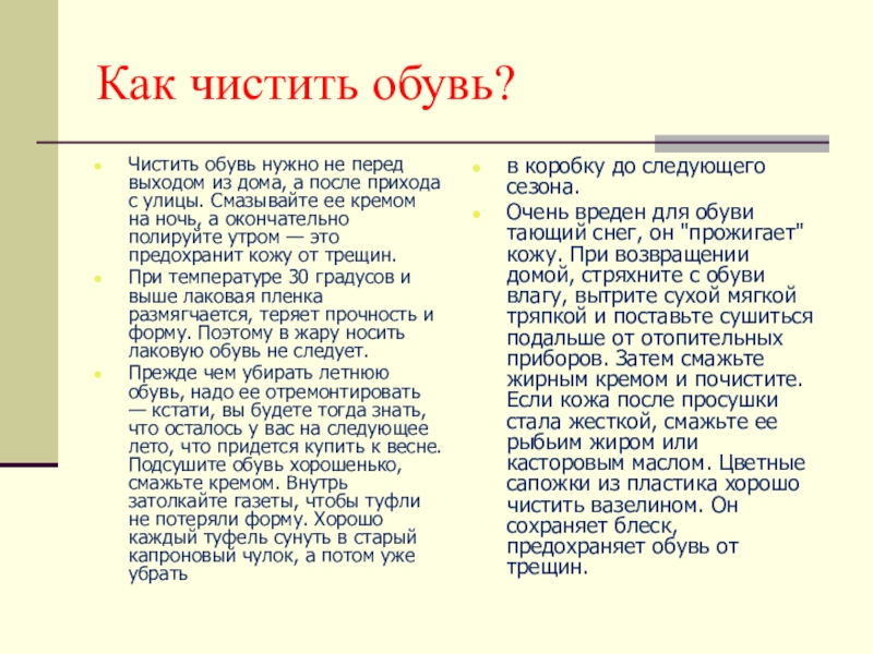 Очень вреден для обуви тающий снег, он "прожигает" кожу. При возвращении домой, стряхните с обуви влагу, вытрите сухой мягкой тряпкой и поставьте сушиться подальше от отопительных приборов. Затем смажьте жирным кремом и почистите. Если кожа после просушки стала жесткой, смажьте ее рыбьим жиром или касторовым маслом. Цветные сапожки из пластика хорошо чистить вазелином. Он сохраняет блеск, предохраняет обувь от трещин.