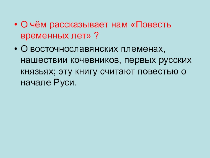 О чём рассказывает нам «Повесть временных лет» ?О восточнославянских племенах, нашествии кочевников, первых русских князьях; эту книгу