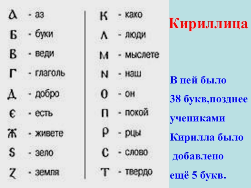 КириллицаВ ней было38 букв,позднее учениками Кирилла было добавлено ещё 5 букв.