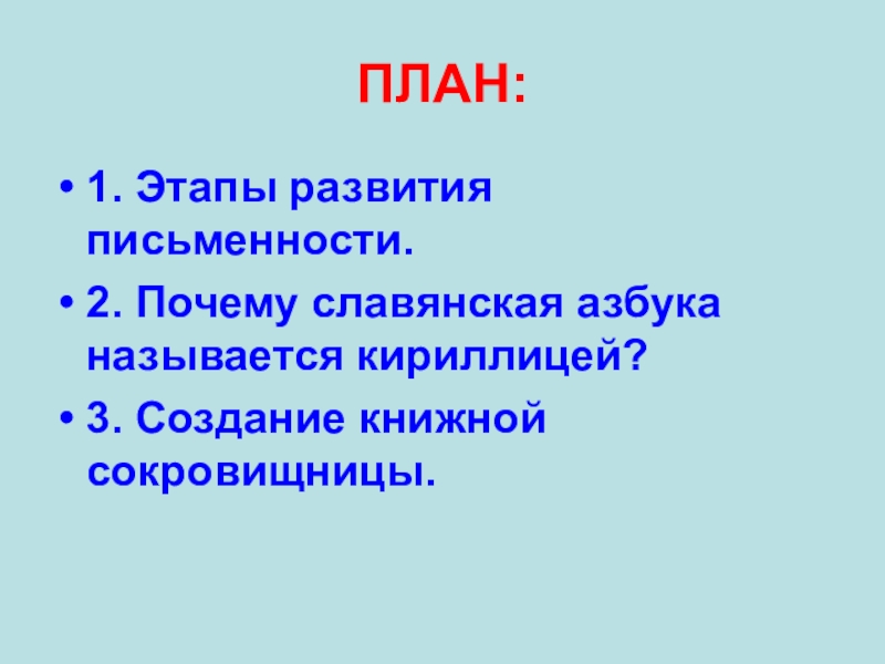 ПЛАН:1. Этапы развития письменности.2. Почему славянская азбука называется кириллицей?3. Создание книжной сокровищницы.
