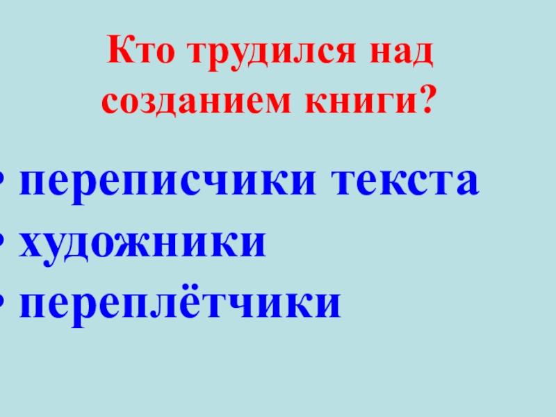 Кто трудился над созданием книги? переписчики текста художники переплётчики