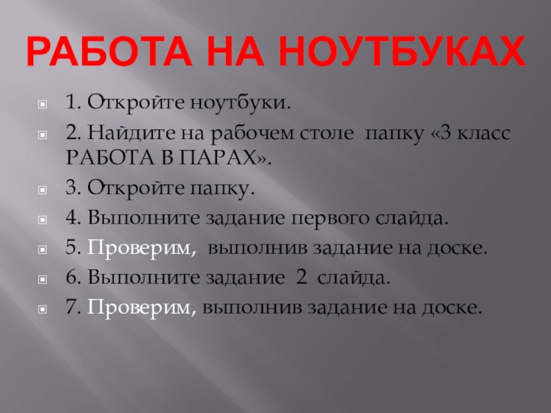 РАБОТА НА НОУТБУКАХ1. Откройте ноутбуки.2. Найдите на рабочем столе папку «3 класс РАБОТА В ПАРАХ».3. Откройте папку.4.