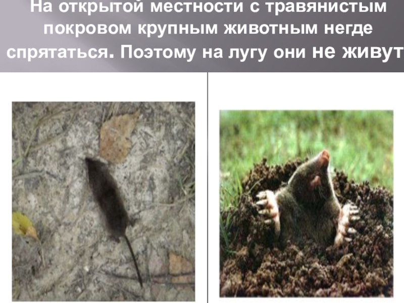 Слайд 22На открытой местности с травянистым покровом крупным животным негде спрятаться. Поэтому