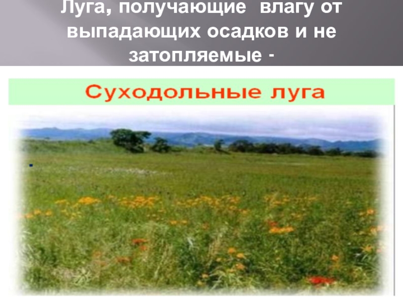 Слайд 12Луга, получающие влагу от выпадающих осадков и не затопляемые -