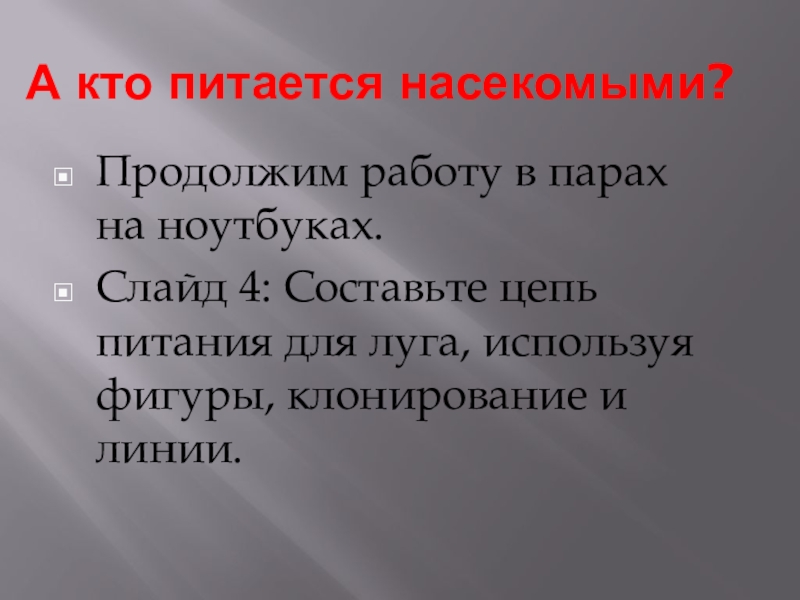 А кто питается насекомыми?Продолжим работу в парах  на ноутбуках. Слайд 4: Составьте цепь питания для луга,
