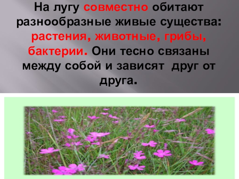 На лугу совместно обитают разнообразные живые существа: растения, животные, грибы, бактерии. Они тесно связаны между собой и