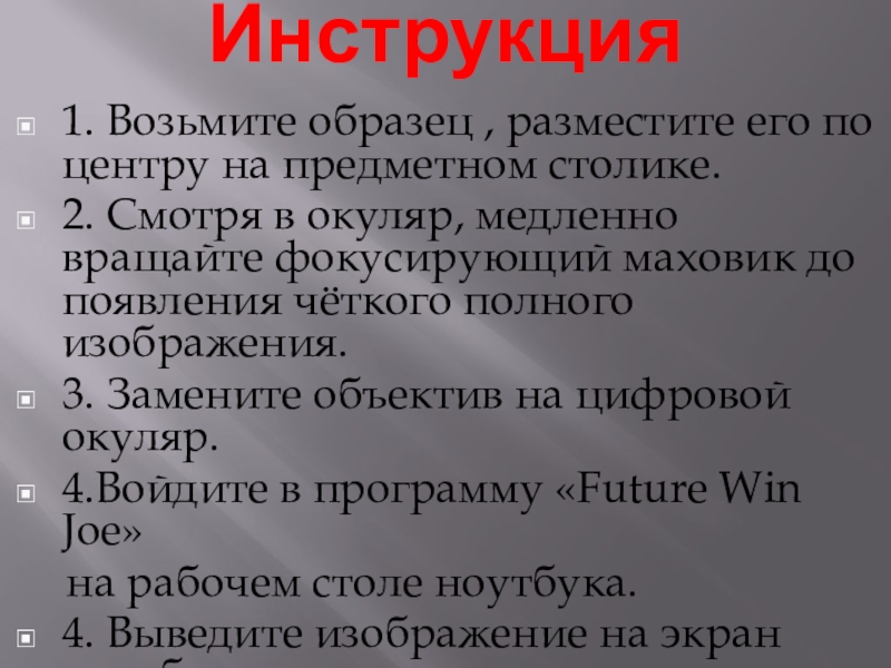 Инструкция  1. Возьмите образец , разместите его по центру на предметном столике.2. Смотря в окуляр, медленно