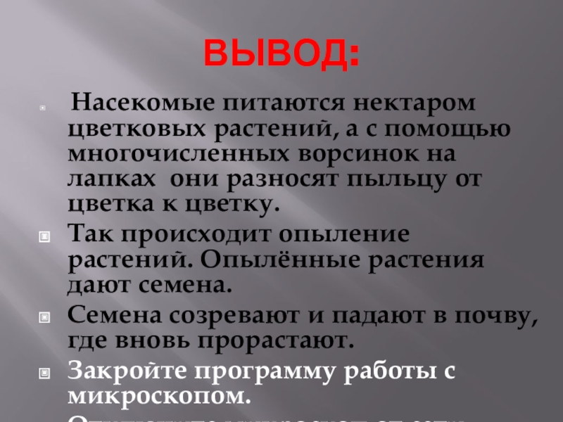 ВЫВОД: Насекомые питаются нектаром цветковых растений, а с помощью многочисленных ворсинок на лапках они разносят пыльцу от