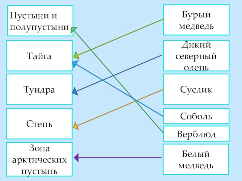 Пустыни и полупустыни ТайгаТундраСтепьЗона арктических пустыньБурый медведьСобольСусликДикий северный олень Белый медведьВерблюд