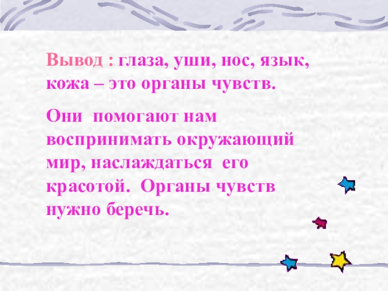 Вывод : глаза, уши, нос, язык, кожа – это органы чувств.Они помогают нам воспринимать окружающий мир, наслаждаться