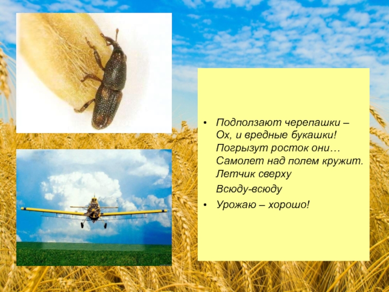 Подползают черепашки –  Ох, и вредные букашки! Погрызут росток они… Самолет над полем кружит.  Летчик