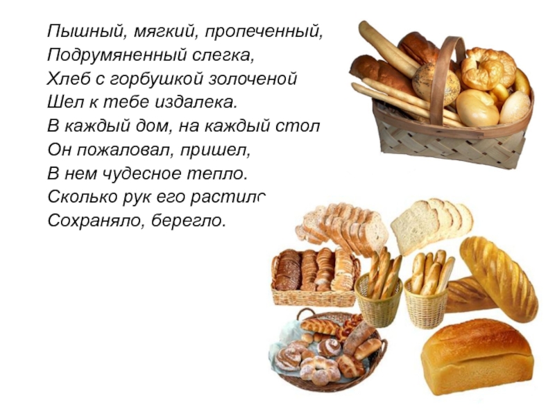 Пышный, мягкий, пропеченный,Подрумяненный слегка, Хлеб с горбушкой золоченойШел к тебе издалека. В каждый дом, на каждый столОн