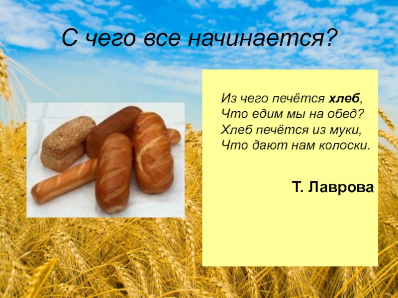 С чего все начинается? Из чего печётся хлеб, Что едим мы на обед? Хлеб печётся из муки, Что дают нам колоски.Т. Лаврова
