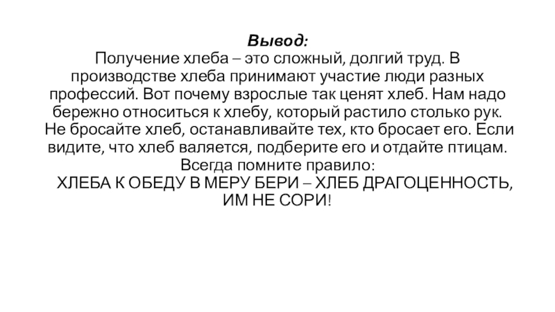 принимают участие люди разных профессий. Вот почему взрослые так ценят хлеб. Нам надо бережно относиться к хлебу, который растило столько рук. Не бросайте хлеб, останавливайте тех, кто бросает его. Если видите, что хлеб валяется, подберите его и отдайте птицам.
