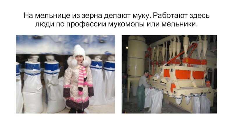 Слайд 20На мельнице из зерна делают муку. Работают здесь люди по профессии