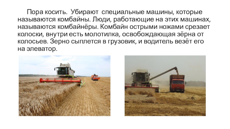 Слайд 12 Пора косить. Убирают специальные машины, которые называются комбайны.