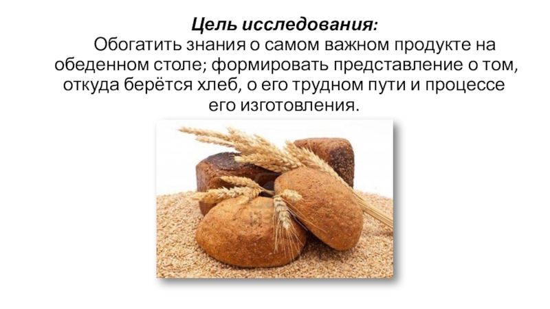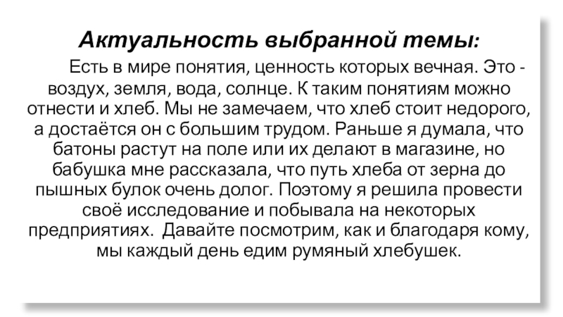 ценность которых вечная. Это - воздух, земля, вода, солнце. К таким понятиям можно отнести и хлеб. Мы не замечаем, что хлеб стоит недорого, а достаётся он с большим трудом. Раньше я думала, что батоны растут на поле или их делают в магазине, но бабушка мне рассказала, что путь хлеба от зерна до пышных булок очень долог. Поэтому я решила провести своё исследование и побывала на некоторых предприятиях. Давайте посмотрим, как и благодаря кому, мы каждый день едим румяный хлебушек.