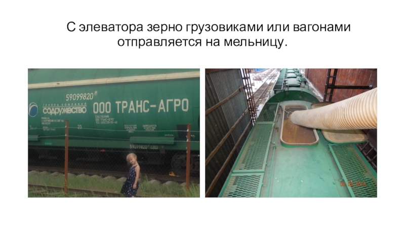 Слайд 19 С элеватора зерно грузовиками или вагонами отправляется на мельницу.