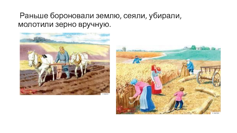 Слайд 10 Раньше бороновали землю, сеяли, убирали, молотили зерно вручную.