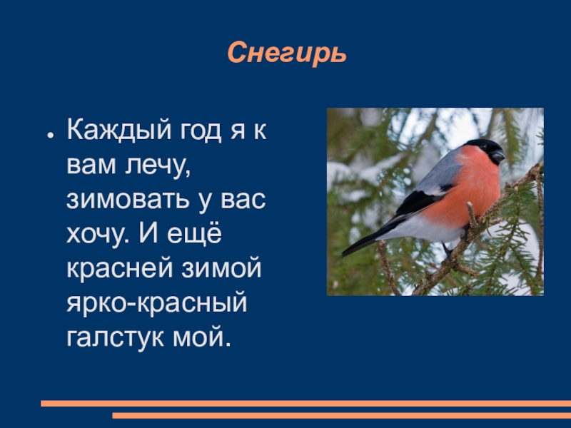 СнегирьКаждый год я к вам лечу, зимовать у вас хочу. И ещё красней зимой ярко-красный галстук мой.