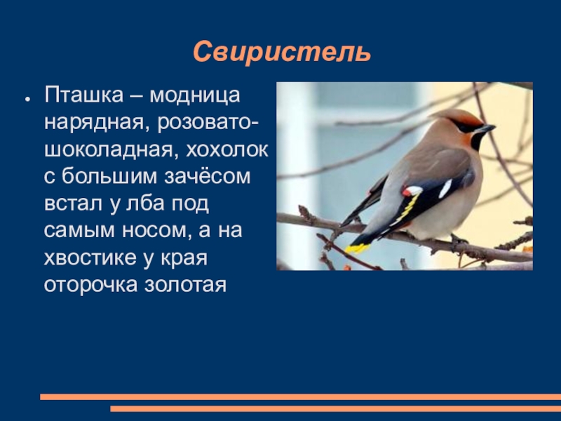 СвиристельПташка – модница нарядная, розовато-шоколадная, хохолок с большим зачёсом встал у лба под самым носом, а на хвостике у края оторочка золотая