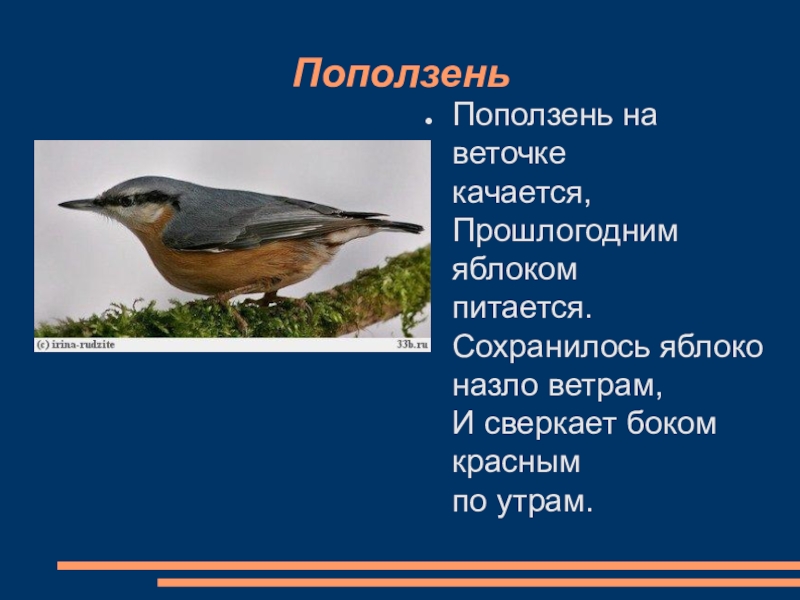 ПоползеньПоползень на веточке  качается,  Прошлогодним яблоком  питается.  Сохранилось яблоко  назло ветрам,  И сверкает боком красным  по утрам.