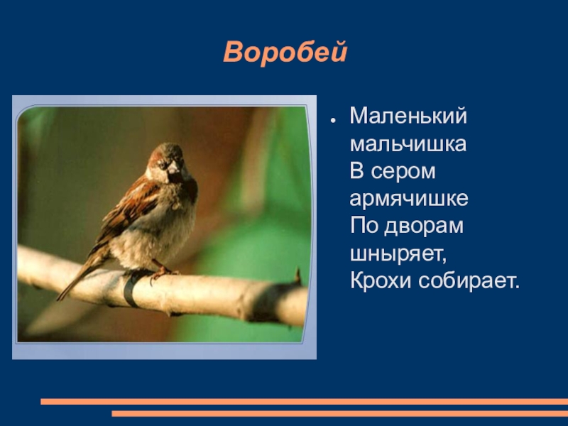 ВоробейМаленький мальчишка В сером армячишке По дворам шныряет, Крохи собирает.
