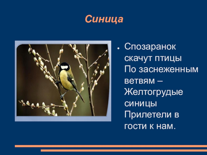 СиницаСпозаранок скачут птицы По заснеженным ветвям – Желтогрудые синицы Прилетели в гости к нам.