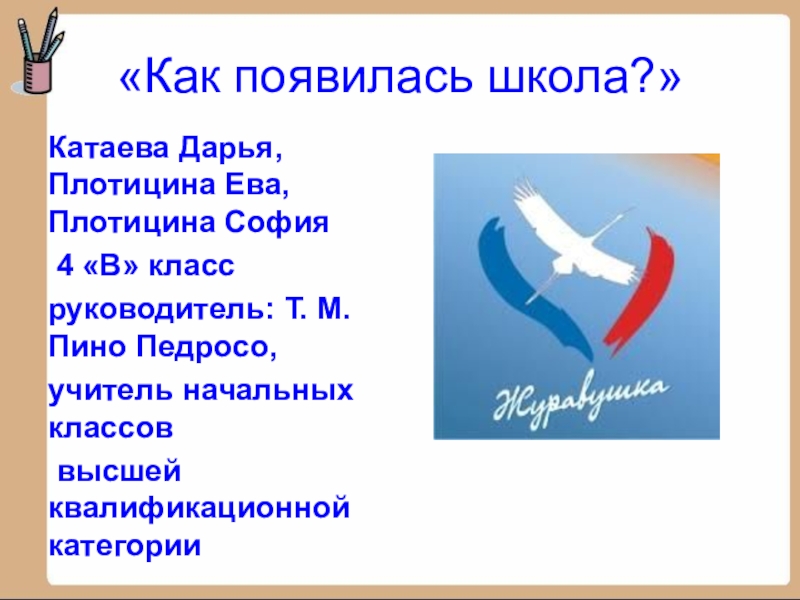 «Как появилась школа?»Катаева Дарья, Плотицина Ева, Плотицина София 4 «В» класс руководитель: Т. М. Пино Педросо,