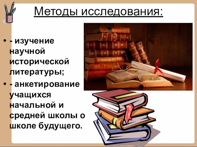 Методы исследования: - изучение научной исторической литературы;- анкетирование учащихся начальной и средней школы о школе будущего.