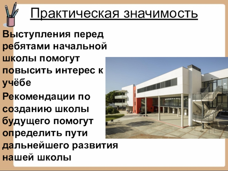 Практическая значимость Выступления перед ребятами начальной школы помогут повысить интерес к учёбе Рекомендации по созданию школы будущего