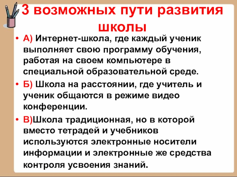 3 возможных пути развития школыА) Интернет-школа, где каждый ученик выполняет свою программу обучения, работая на своем компьютере