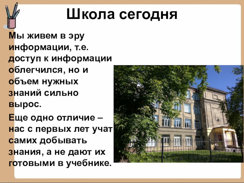 Школа сегодня Мы живем в эру информации, т.е. доступ к информации облегчился, но и объем нужных знаний
