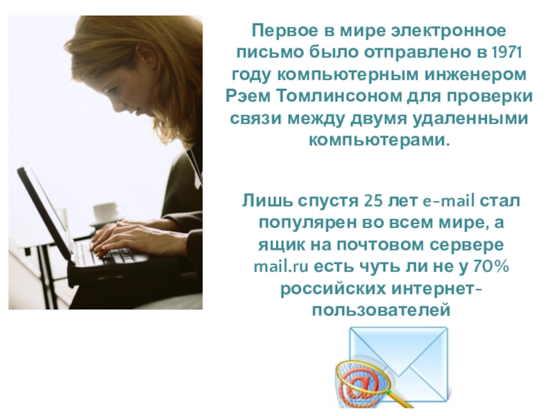 Лишь спустя 25 лет e-mail стал популярен во всем мире, а ящик на почтовом сервере mail.ru есть чуть ли не у 70% российских интернет-пользователей