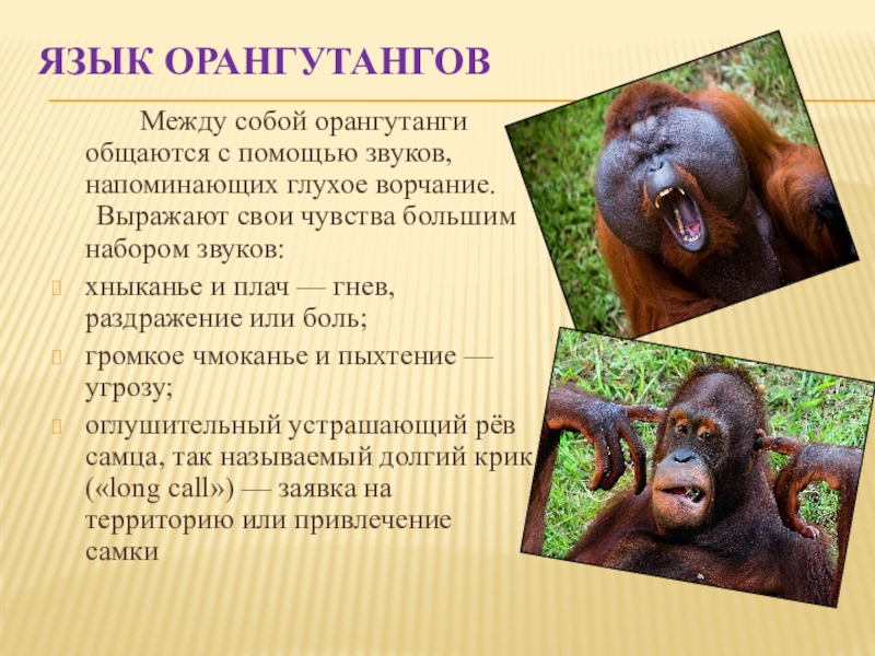 Язык орангутангов   		Между собой орангутанги общаются с помощью звуков, напоминающих глухое ворчание. 	Выражают свои чувства