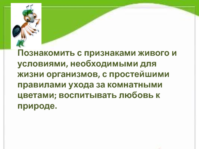 Познакомить с признаками живого и условиями, необходимыми для жизни организмов, с простейшими правилами ухода за комнатными цветами; воспитывать любовь к природе.