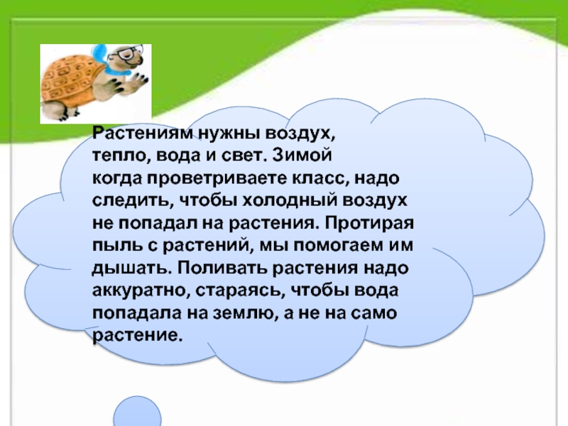 Растениям нужны воздух,тепло, вода и свет. Зимойкогда проветриваете класс, надо следить, чтобы холодный воздух не попадал на