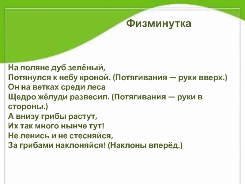 ФизминуткаНа поляне дуб зелёный, Потянулся к небу кроной. (Потягивания — руки вверх.) Он на ветках среди леса Щедро жёлуди