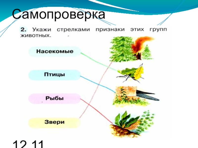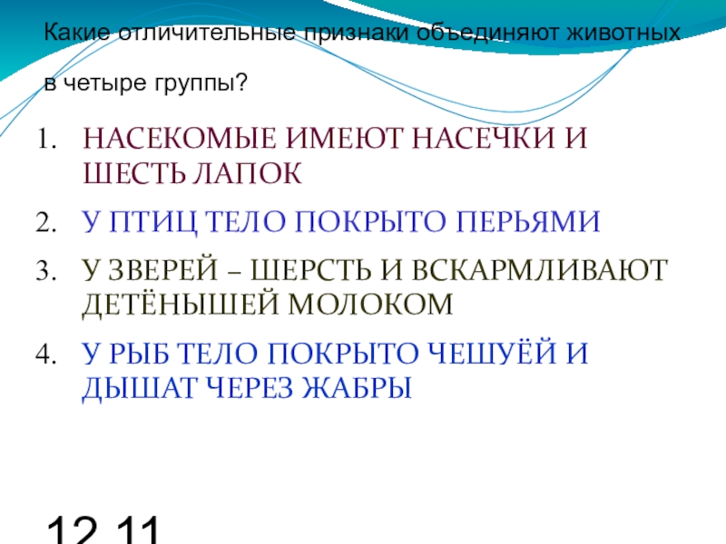12.11.14Какие отличительные признаки объединяют животных в четыре группы? НАСЕКОМЫЕ ИМЕЮТ НАСЕЧКИ И ШЕСТЬ ЛАПОКУ ПТИЦ ТЕЛО ПОКРЫТО